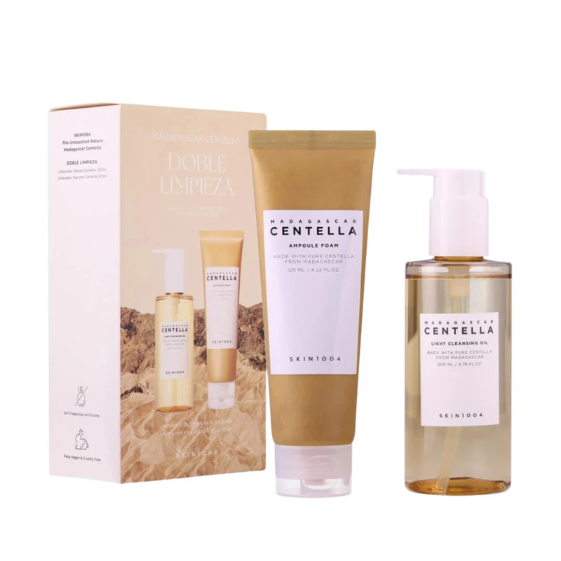 دو محصول پاککننده SKIN1004، شامل روغن پاککننده سبک سنتلا و فوم آمپول سنتلا، به طور مؤثر و ملایم پوست صورت را پاکسازی میکنند.
