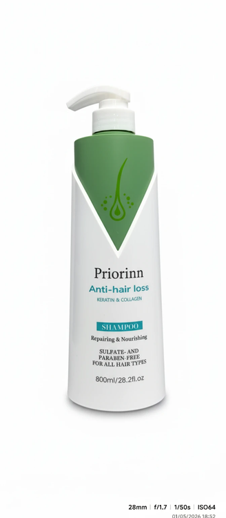 شامپو ضد ریزش مو Priorinn، با ترکیب کراتین و کلاژن، برای تقویت و تغذیه موهای ضعیف و شکننده طراحی شده است.