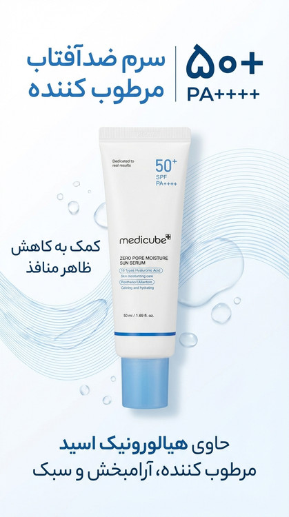 سرم ضدآفتاب مدیکیوب Zero Pore Moisture SPF 50+ یک ضدآفتاب سبک با بافت سرمی است که علاوه بر محافظت قوی در برابر اشعههای مضر UVA و UVB، به آبرسانی عمیق و بهبود ظاهر منافذ پوست کمک میکند.