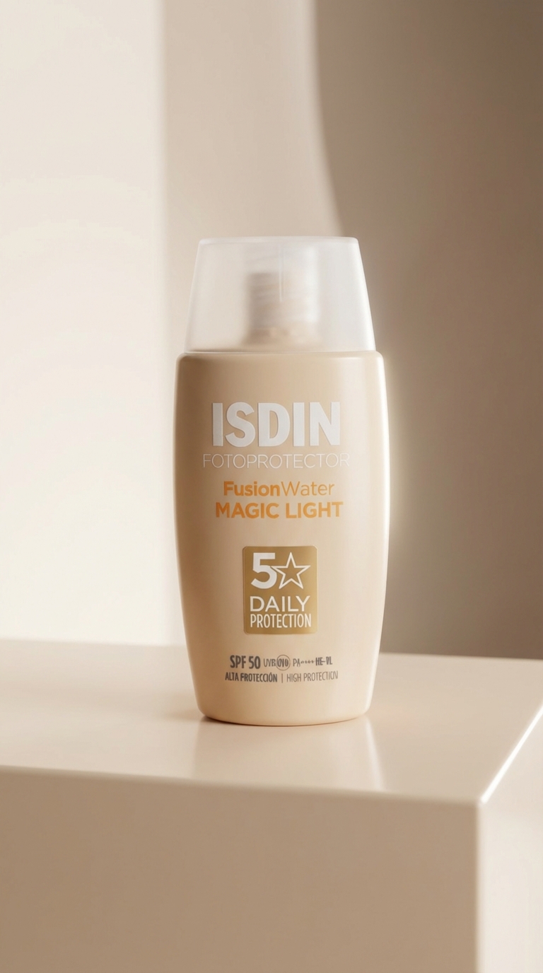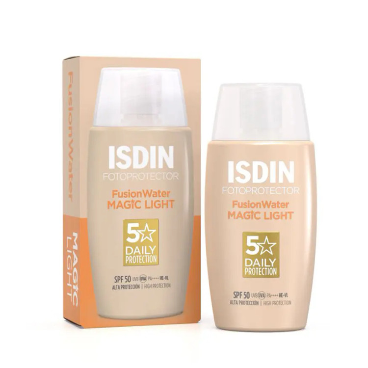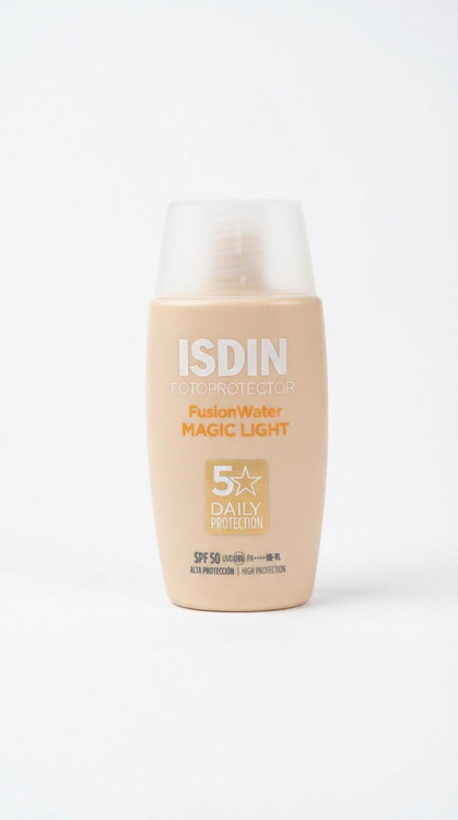 ضدآفتاب Fusion Water Magic Light ایزدین SPF 50 یک ضدآفتاب رنگی بسیار سبک با پوشش روشن و طبیعی است که همزمان از پوست در برابر اشعههای UVA و UVB محافظت میکند و رنگ پوست را یکنواختتر و شفافتر نشان میدهد.