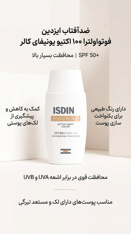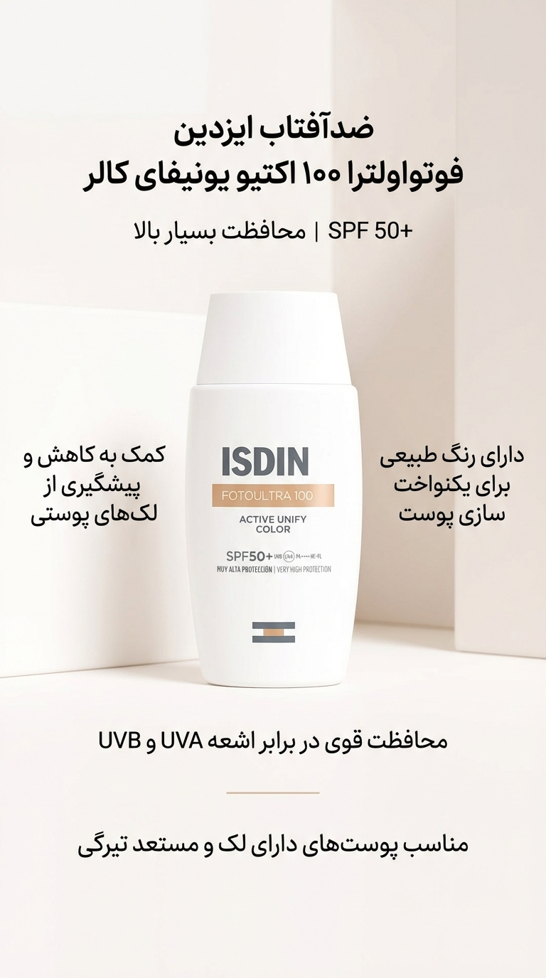 ضدآفتاب FotoUltra 100 Active Unify Color ایزدین SPF 50+ یک ضدآفتاب درمانی رنگی با محافظت بسیار بالا است که بهطور تخصصی برای پیشگیری و کمک به کاهش لکهای پوستی طراحی شده است.