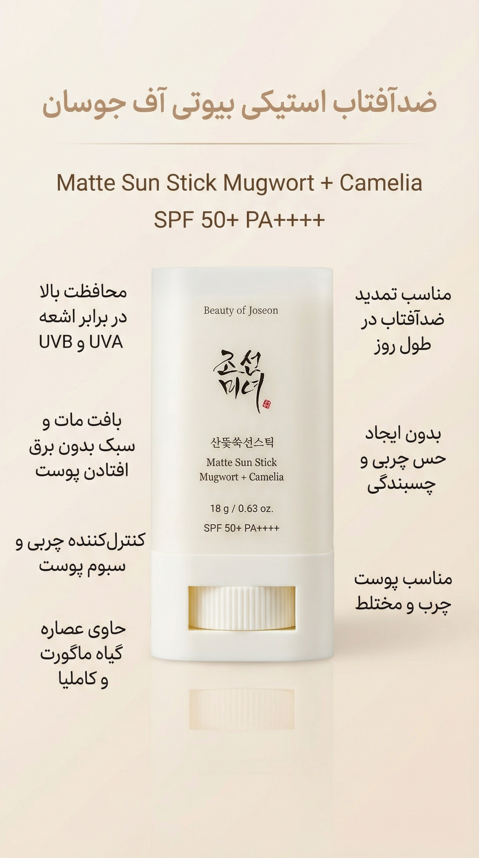 ضدآفتاب Matte Sun Stick Mugwort + Camellia بیوتی آف جوسان SPF 50+ PA++++ یک ضدآفتاب استیکی سبک و ماتکننده است که برای محافظت بالا در برابر اشعههای UVA و UVB طراحی شده و گزینهای بسیار کاربردی برای تمدید ضدآفتاب در طول روز محسوب میشود. این محصول با فرمولاسیون فیزیکی–شیمیایی متعادل و بافت کاملاً خشک و بدون چسبندگی، تجربهای متفاوت از ضدآفتابهای استیکی ارائه میدهد.