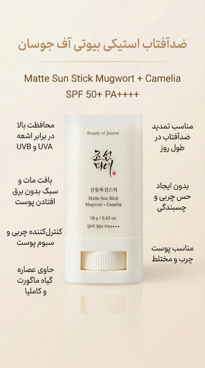 ضدآفتاب Beauty of Joseon Matte Sun Stick Mugwort + Camellia SPF 50+ PA++++ انتخابی عالی برای افرادی است که بهدنبال تمدید آسان ضدآفتاب، فینیش کاملاً مات، کنترل چربی و سازگاری با پوست چرب و حساس هستند.