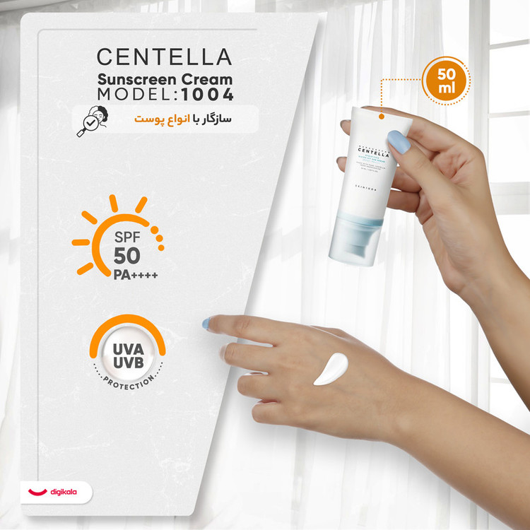 کرم ضد آفتاب بدون رنگ سنتلا، 50 SPF، مدل 1004، مناسب پوست حساس، نرمال و خشک و حجم 50 میلیلیتر، محافظت کننده در برابر اشعه UVA و UVB، بدون تست حیوانی، ++++PA، آبرسان، ضد التهاب، با ماندگاری 3 ساعته